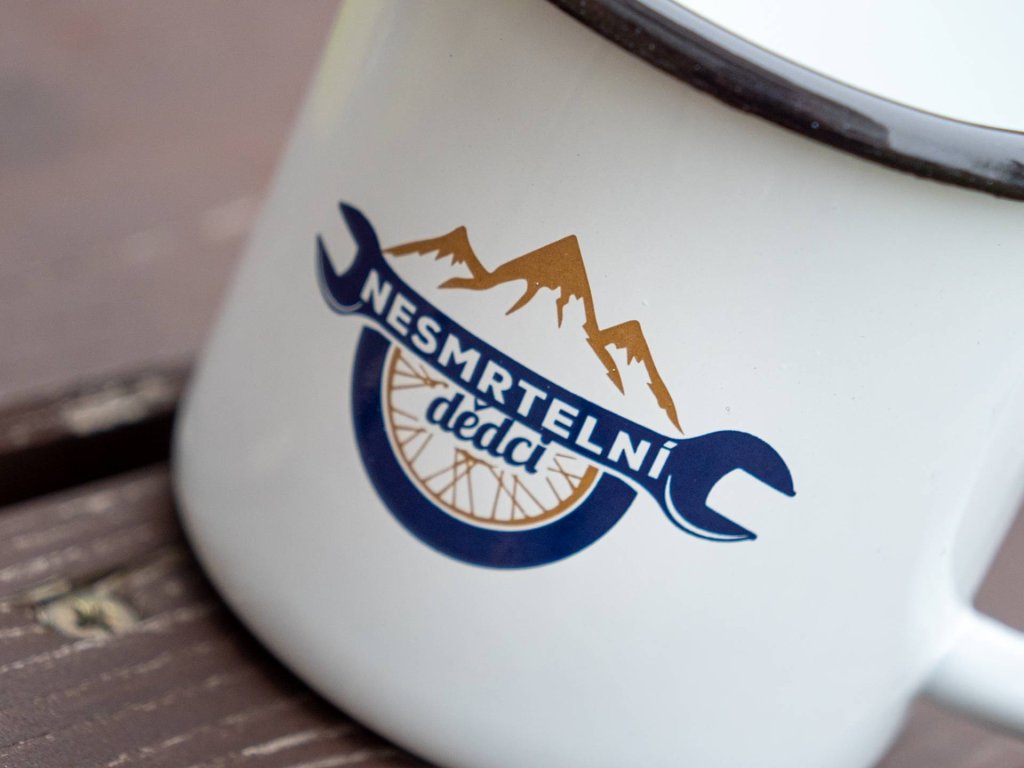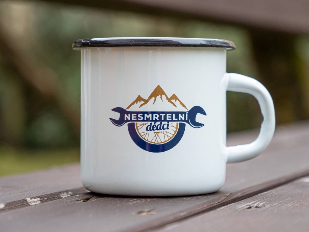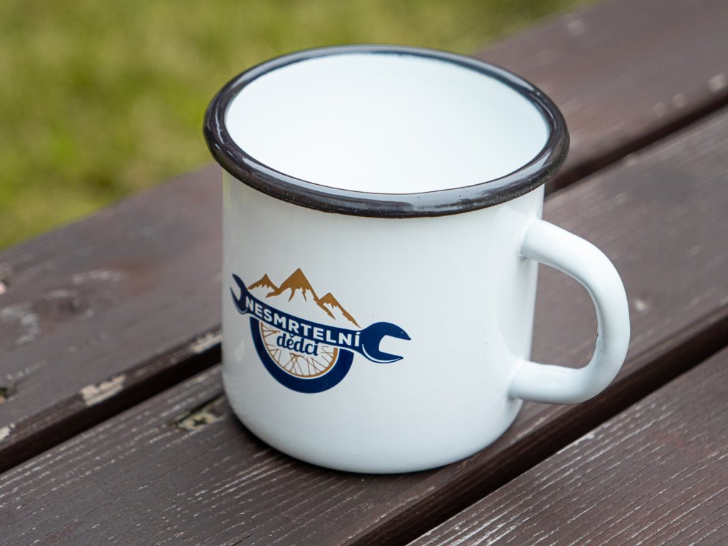 Smaltovaný hrnek s logem Nesmrtelných dědků je ideální jak na cesty, tak třeba aj do garáže, kde se nemusíš bát, že ho rozflákneš :-D